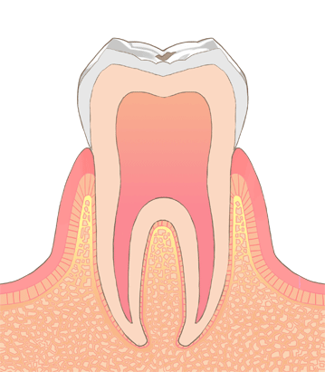 C1(エナメル質う蝕)は歯の最も外側のエナメル質に限局した虫歯です。痛みはほとんどなく、虫歯部分を最小限削りコンポジットレジン(CR)で充填します。当院では光照射時に天然歯の色を読んで素材の色を変えるCRを使用しております。