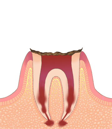 C4(歯冠崩壊)は歯の頭の部分が大きく崩壊し、歯根だけが残った状態です。保存が困難な場合もありますが、可能な限り歯根を残す治療法を検討いたします。